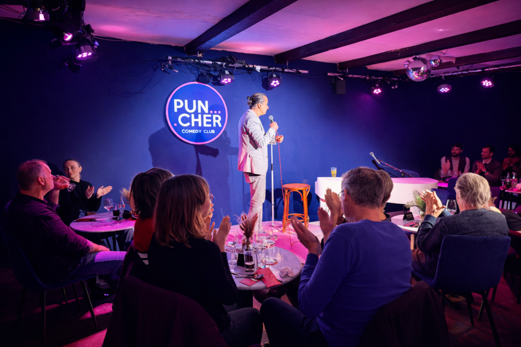 Maar liefst 6 gangen, die tezamen voor een heerlijke maaltijd zorgen. En daarbij is het nog een comedyshow ook. Je dineert casual aan de kleine bijzettafeltjes rondom het podium. Vooraf een amuse, soep en voorgerecht, in de pauze een spoom en hoofdgerecht, en na de show staat het dessert nog op je te wachten! Een perfecte avond dus.